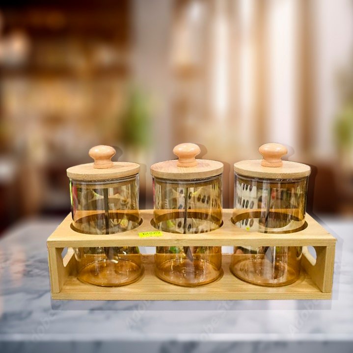 3 Pcs Glass Jar With Wooden Stand