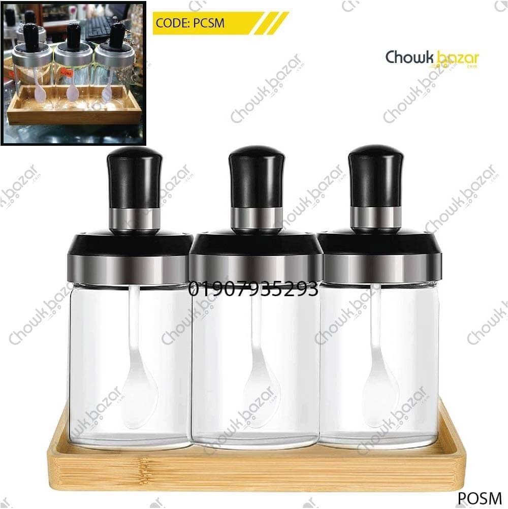 3 PCS GLASS SPICE JAR SET WIITH WOODEN TRAY